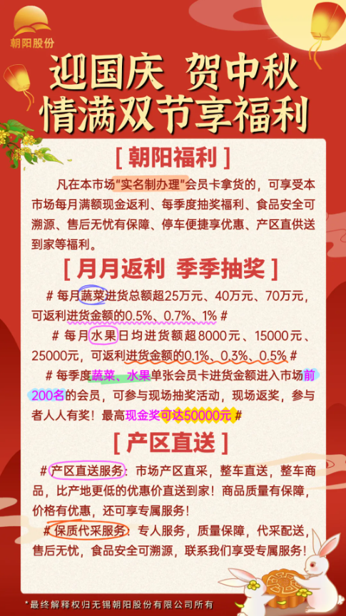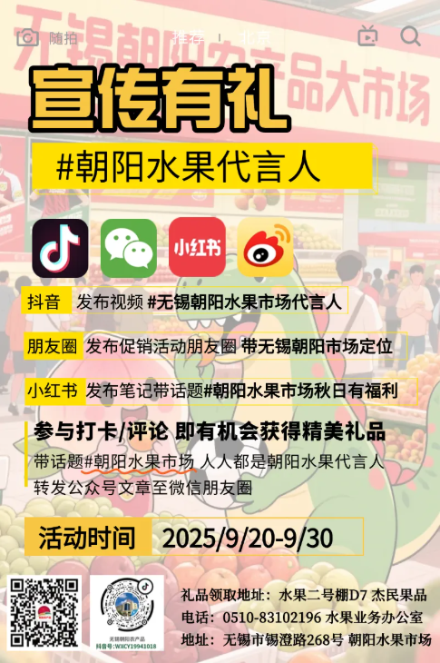 國慶旗將紅,中秋月漸圓! 雙節(jié)同慶的熱鬧里, 怎么少得了新鮮水果的甜? 朝陽水果批發(fā)市場 雙節(jié)專屬促銷已上線, 為你的團圓宴、走親禮 備好滿滿 “果” 力!           想給家人朋友送心意?市場能定制水果禮盒! 挑好新鮮菜果,搭配成盒,體面又健康! 中秋走親戚、國慶訪好友,拎著超有范兒。 而且市場早早就為雙節(jié)做足準(zhǔn)備,不僅新增了清晰的引導(dǎo)標(biāo)識,還掛滿了鮮艷的紅旗與節(jié)日橫幅,紅綢隨風(fēng)飄動,果香伴著喜慶,一進市場就能感受到濃濃的雙節(jié)氛圍,采購時連心情都跟著熱鬧起來! 這個雙節(jié),囤新鮮、享優(yōu)惠、送好禮,就來朝陽農(nóng)產(chǎn)品大市場,讓新鮮菜果,把節(jié)日氛圍拉滿! (供稿:張柯宇) |