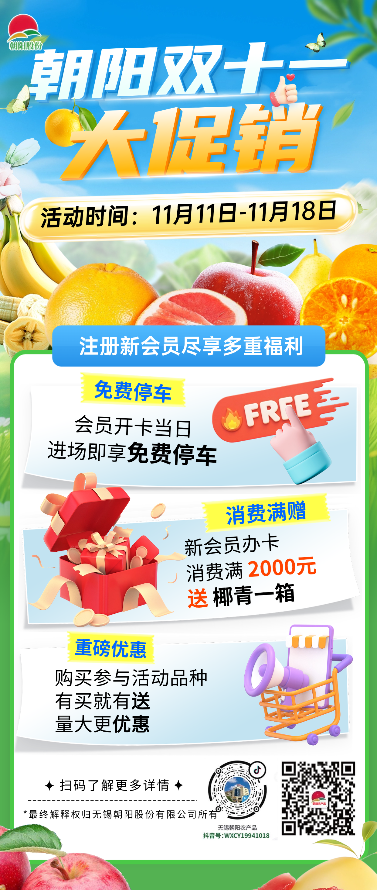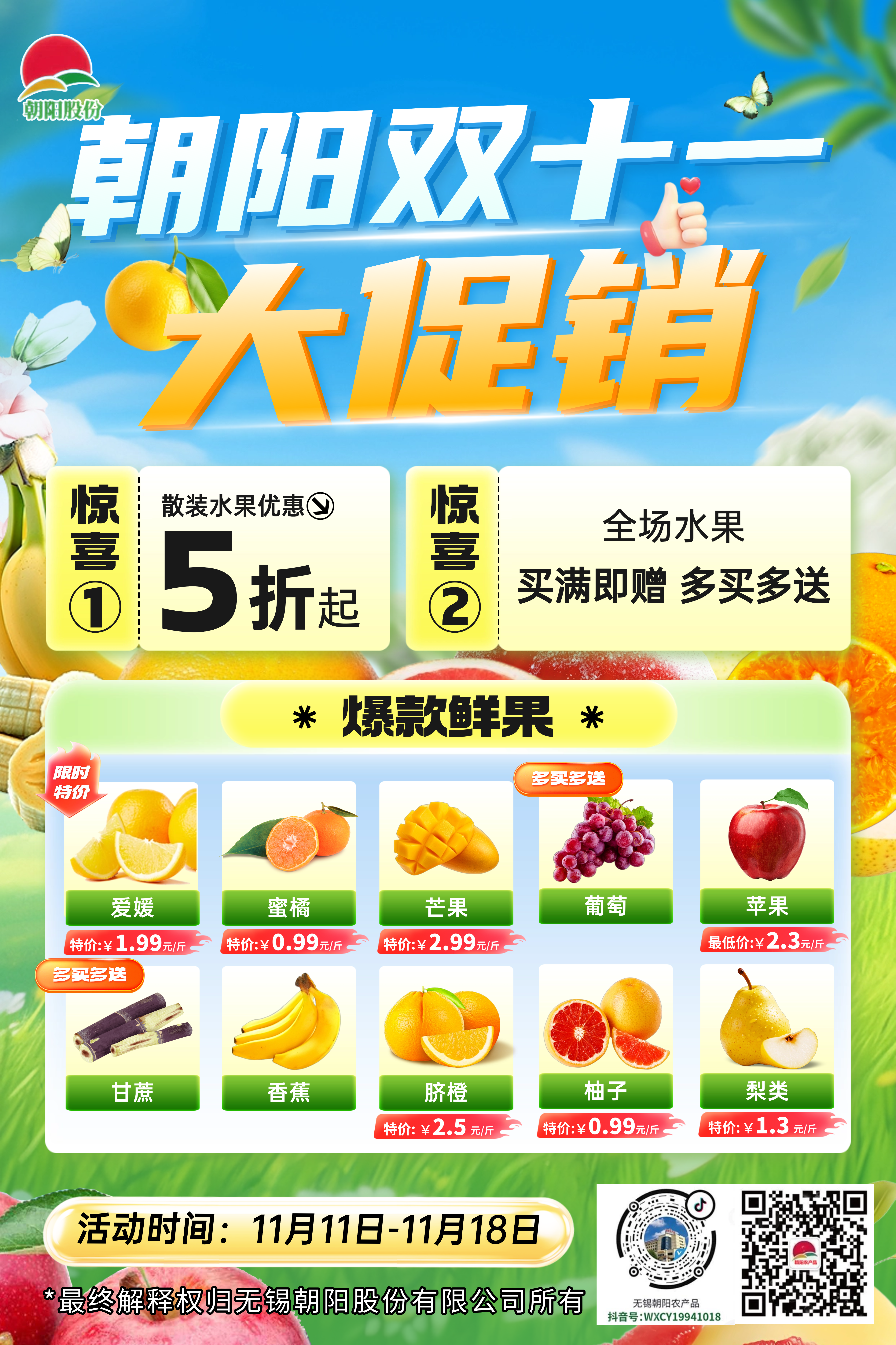 愛媛果凍橙:爆汁流心的 “柑橘界小甜心”,皮薄如紙一剝即開,果肉細(xì)嫩無渣,入口化渣。雙十一專屬,滿20件送1件,滿30件送2件,限量供應(yīng),先到先得! 紅富士蘋果:精選優(yōu)質(zhì)產(chǎn)區(qū),脆甜多汁、果香濃郁,果形飽滿色澤鮮亮。雙十一福利優(yōu)惠5折起,全家秋冬補維生素首選! 蜜橘:果皮易剝、果肉清甜無籽,產(chǎn)地直采省去中間環(huán)節(jié),新鮮又實惠。雙十一狂歡,最低價0.99元/斤,快來囤滿,承包整個秋日酸甜! 香蕉:來自黃金種植帶,自然成熟不催熟,果肉綿密香甜、果香濃郁。滿30件送1件,滿50件送2件,新鮮直達餐桌! 柚子:皮薄肉厚、果肉晶瑩剔透,酸甜比例恰到好處。超值福利價0.99元/斤,解鎖秋冬潤燥神器! 臍橙:江西贛南核心產(chǎn)區(qū)直供,果大形正、橙香濃郁,咬一口爆汁酸甜。雙十一專屬價2.5元 / 斤,量多更優(yōu)! 梨類:果肉細(xì)膩如凝脂,清甜多汁無渣,清熱潤肺超適合秋冬。促銷價1.3元/斤,老人小孩都愛吃! 整根甘蔗:精選廣西、浙江優(yōu)質(zhì)產(chǎn)區(qū),粗壯飽滿、汁水充足。獨特整根銷售方式,寓意 “甜蜜美滿、節(jié)節(jié)高升”,雙十一特惠滿30件送1件,滿50件送2件,西外場交易區(qū)專屬供應(yīng),榨汁送禮兩相宜! 葡萄:顆粒飽滿如寶石,脆甜無籽、帶著淡淡果香。雙十一專屬促銷,滿15件送1件,滿25件送2件,新鮮現(xiàn)摘直達! 芒果:核心產(chǎn)區(qū)直供,果香濃郁、果肉細(xì)膩,咬一口香甜多汁。雙十一特惠價低至2.99元/斤,另有滿20件送1件、滿30件送2件滿贈活動,無論是鮮食還是做甜品都超合適!  蔬菜:多款應(yīng)季時蔬直降讓利,產(chǎn)地直采新鮮直達,品類豐富品質(zhì)在線,讓你用實惠價格囤滿健康鮮蔬,雙十一囤菜正當(dāng)時!! ?品質(zhì)保障:專業(yè)市場嚴(yán)格篩選,每款鮮果品質(zhì)放心 雙十一購物季,朝陽農(nóng)產(chǎn)品大市場十余款爆款蔬果齊上陣,用超低價福利、新鮮飽滿的品質(zhì),邀您共赴這場 “囤貨 + 嘗鮮” 的蔬果盛宴!11月11日-18日,趕緊約上家人朋友,把全球好果、國內(nèi)大牌帶回家,讓這個秋冬甜意滿滿!